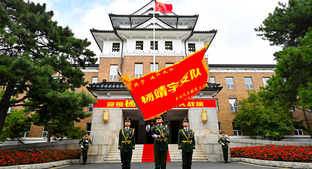 礼兵高擎战旗、迎风挥舞,“杨靖宇支队”五个金色大字闪耀夺目。“杨靖宇支队”所在部队官兵代表、杨靖宇将军后人,吉林杨靖宇干部学院、杨靖宇烈士陵园、杨靖宇将军殉国地管理处干部职工代表,大中小学学生代表,省委常委同志和省人大常委会、省政府、省政协、省军区、武警吉林省总队班子成员依次与战旗合影、向战旗致敬。随后,礼兵将战旗护送到中共吉林省委主楼,另外两面战旗将分别陈列在吉林省近现代史展和通化杨靖宇烈士陵园。