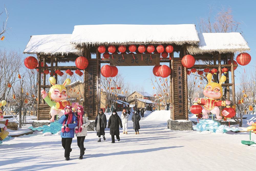 梅河口着力打造独具特色的冰雪全域旅游城。图为游客在知北村观光游玩。