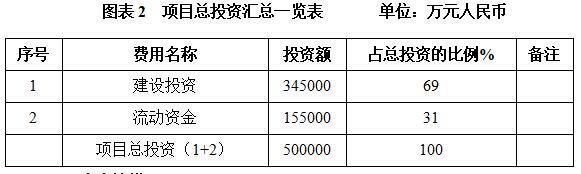 本项目总投资为500000万元,其中:建设投资345000万元,流动资金155000万元。