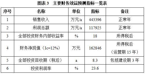 项目达产后,年销售收入443396万元,利润117925万元,投资回收期8.3年(税后,含建设期3年),投资利润率23.6%。