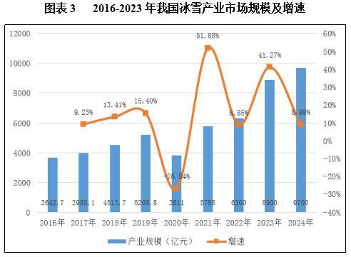 2016年至2019年,我国冰雪产业市场规模逐年增长,受疫情影响,2020年冰雪产业规模降低到3811亿元。2021年,中国冰雪产业逐渐回温,市场规模达5788亿元,同比增长51.88%;2022年产业规模为6300亿元。随着疫情防控放开,我国冰雪旅游消费保持快速增长态势,冰雪旅游正在从“有没有”向“好不好”转变。2023年我国冰雪产业市场规模达到了8900亿元,2024年达到9700亿元,预测2025年将突破10000亿,达到10053亿元。