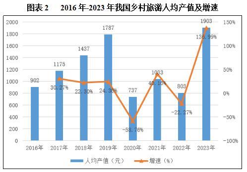 乡村旅游发展是以农业为依托,以农村为空间,以农民为主体、以城市居民消费为市场,既扎根于“三农”,又对接城市需求和现代消费,对农村经济发展、城镇化进程、城乡统筹发展,都有着十分重要的意义。据统计,党的十八大以来,全国乡村旅游人次从近8亿跃升到30亿以上,年均增速超过20%。乡村旅游已成长为近万亿级收入规模的新兴产业,大幅提升了农村居民收入。据统计,2023年我国农民人均旅游产值达到1903元,同比增加1100元,较2021年增加870元。