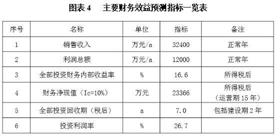 项目建成后,年销售收入32400万元,利润12000万元,投资回收期7.0年(税后,含建设期2年),投资利润率26.7%。