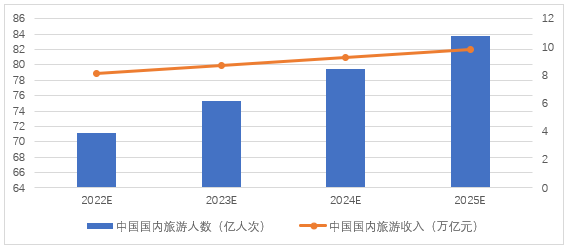 图1 2022年—2025年中国国内旅游人数、收入预测情况