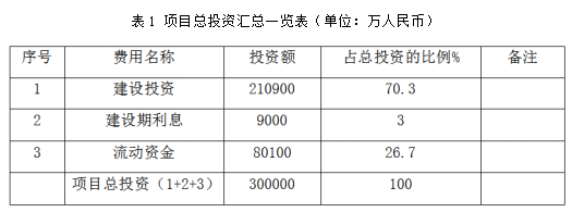 项目总投资300,000万元。其中:固定资产210,900万元,流动资金80,100万元。