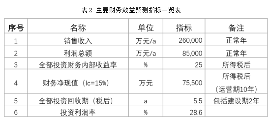 项目建成产后,预计年销售收入260,000万元、利润85,000万元,投资回收期5.5年(税后,含建设期2年),投资利润率28.6%。