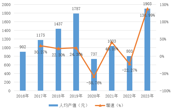 图表2 2016年-2023年我国乡村旅游人均产值及增速