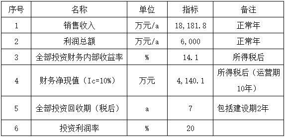 项目达产后,年销售收入18,181.8万元,利润6,000万元,投资回收期7年(税后,含建设期2年),投资利润率20%。