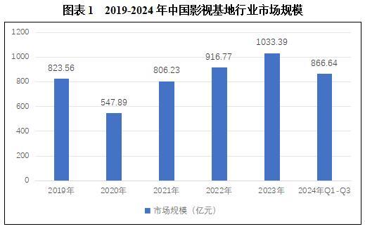影视基地是影视产业链条中的核心环节,其职责包括扶持制作优质影片、传播影视文化,提供大量就业岗位及推动地域经济发展和提升地区形象等多方面。基地对于相关行业的发展起着强大的推动力,成为了将创新、协调、绿色、开放、共享的新发展观念运用到影视领域的重要范例。随着全球影视产业的蓬勃发展,影视基地在影视制作业、文旅业及其它关联产业中的地位更加突出。近些年以来,伴随着数字化处理、虚拟现实(Virtual Reality,VR)以及增强现实(Augmented Reality,AR)等技术在电影艺术创作领域内的广泛运用,这类科技所带来的技术革新与实际应用不仅大幅度地提升了影视作品的艺术价值及其观赏性,同时也极大地缩减了整个制作流程的所需花费,从而有效提高了生产效率。此外,此类前沿技术的广泛运用,也在很大程度上被深度融合到了影视产业基地的日常运营管理中,为整个行业的高速发展注入了全新的活力与动力。统计数据显示,2019年中国影视基地行业市场规模823.56亿元,2023年中国影视基地行业市场规模1033.39亿元。