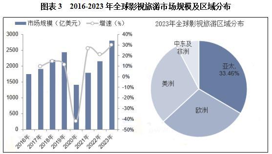无论在国内还是在国外,影视旅游产业都有着较为广阔的发展空间。早在1963年,好莱坞影城的出现就掀起了一股影视旅游热潮。20世纪初,许多发达国家纷纷建立环球影视主题公园,为影视旅游业的发展奠定了坚实的基础。数据显示,2023年全球影视旅游市场规模约2798.2亿美元,同比上涨29.74%。从区域分布情况来看,全球影视旅游行业主要集中分布于亚太、欧洲和美洲地区,其中亚太地区2023年市场占比达33.46%,排在首位。