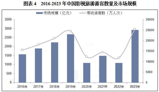 自2020年以后,国内的旅游影视业发展步入了发展的停滞期,我国文化部门及政府部门纷纷给予了影视文化旅游产业发展足够的支持,使得影视旅游业重新焕发生机。据统计,2023年中国影视旅游市场规模达2933.2亿元,带动游客数量25390万人次,分别同比增长168.2%、115.7%。