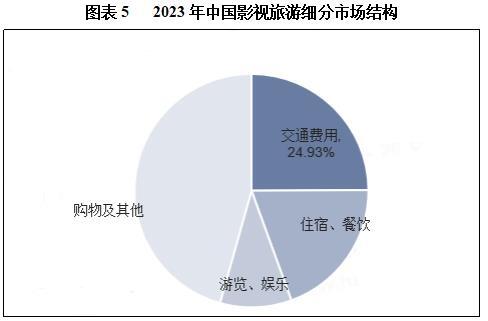 影视旅游行业是一个结合了影视制作与旅游资源的新兴领域,它通过影视作品、节目和活动等形式,吸引观众和游客,促进旅游业的发展。2023年我国影视旅游市场规模约2933.2亿元,从细分市场构成来看,交通费用规模占比最大,为24.93%,其次是住宿、餐饮,占比19.53%。
