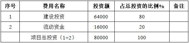 本项目总投资为80000万元,其中:建设投资64000万元,流动资金16000万元。