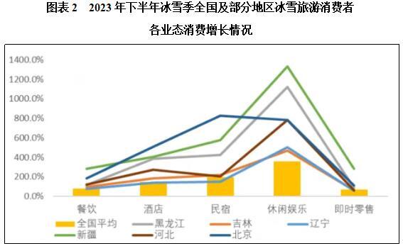旅游业是具有较强综合带动作用的行业,冰雪旅游休闲虽然以“冰雪风光、冰雪运动”等作为核心吸引物,但其近年来的快速发展离不开旅游目的地的餐饮、住宿、娱乐、休闲、购物等多种消费业态的跨场景融合。美团数据显示,2023年下半年冰雪季,全国异地游客在餐饮、酒店、民宿、休闲娱乐、即时零售等业态上的消费规模分别同比增长了76.4%、146.8%、196.5%、356.6%和65.7%,而黑龙江、吉林、辽宁、新疆、河北、北京等热门的冰雪旅游目的地以上几类业态消费规模的同比增速基本均高于全国水平,其中新疆维吾尔自治区这几类业态的平均增速超过570%,黑龙江平均增速超过420%,可见业态多样性和消费融合度对当地旅游发展的重要性。