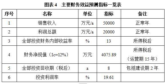 项目达产后,年销售收入50000万元,利润20000万元,投资回收期8年(税后,含建设期2年),投资利润率19.61%。