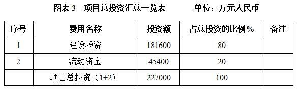 本项目总投资227000万元,其中:建设投资181600万元,流动资金45400万元。
