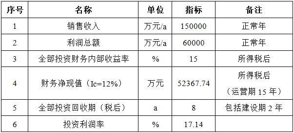 项目达产后,年销售收入150000万元,利润60000万元,投资回收期8年(税后,含建设期2年),投资利润率17.14%。