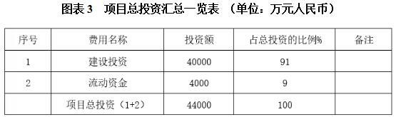 项目总投资4.4亿元,其中建设投资4亿元,流动资金0.4亿元。