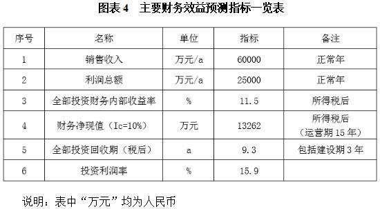 项目建成后,预计年销售收入60000万元,年利润25000万元,投资回收期9.3年(税后,含建设期3年),投资利润率15.9%。