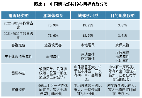 按核心目标客群,国内滑雪场分为三类:旅游体验型、城郊学习型及目的地度假型。2022-2023年此三类雪场在全部雪场中占比分别为76.90%、19.23%、3.87%。