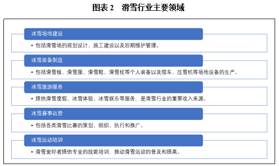 滑雪行业的主要领域包括冰雪场地建设、冰雪装备制造、冰雪旅游服务、冰雪运动培训。