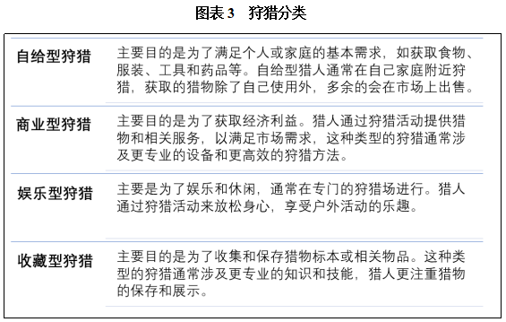 根据狩猎目的的不同,可将狩猎分为自给型狩猎、商业型狩猎、娱乐型狩猎和收藏型狩猎。