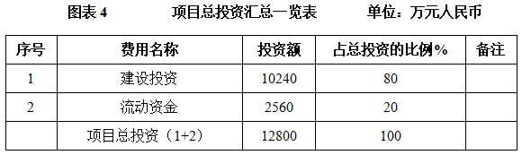本项目总投资为12800万元,其中:建设投资10240万元,流动资金2560万元。