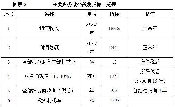 项目达产后,年销售收入18286万元,利润2461万元,投资回收期6.5年(税后,含建设期2年),投资利润率19.23%。