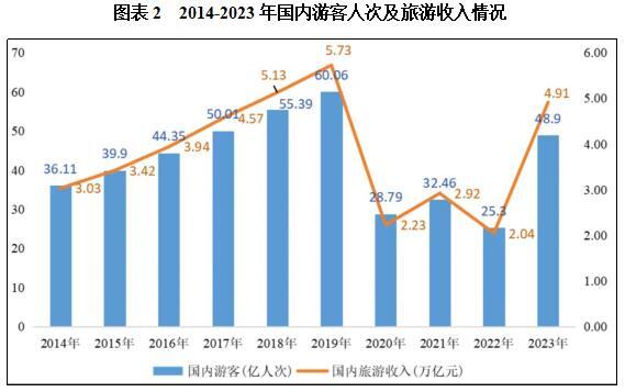 近十年,国内旅游市场呈现波荡式发展阶段,继2019年达到发展高峰,在经历三年低迷期后,2023年旅游市场强劲恢复。2023年,国内旅游总人次48.9亿,居民国内出游总花费4.91万亿元,分别同比增长93.28%和140.69%,分别恢复至2019年的81%和86%,旅游市场强劲复苏,旅游业在稳增长、扩内需、促消费、强信心等方面的作用进一步彰显。
