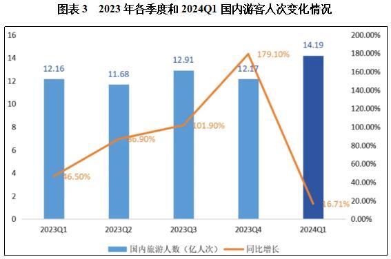 从各季度国内旅游接待人数情况来看,2023年,在文旅市场供需两旺的背景下,各季度之间的差异缩小,呈现“淡季不淡,旺季更旺”特征,其中,第三季度为传统旅游旺季,受暑期旅游热利好驱动,国内旅游人数最高;第一季度和第四季度基本持平,均超12亿人次;第二季度最低;与2022年同期相比,各季度国内旅游人次均有所增长,第四季度增长显著,增幅高达约1.8倍,明显高于其他季度。2024年一季度,国内出游人次14.19亿,同比增加2.02亿,同比增长16.7%,增速放缓,但仍然保持向好态势。