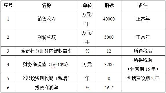 项目达产后,年销售收入40000万元,利润5000万元,投资回收期8年(税后,含建设期2年),投资利润率16.7%。