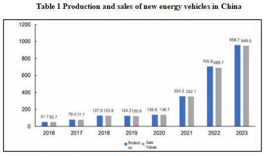 From 2016 to 2020, the growth rate of production and sales of new energy vehicles in China was relatively stable and maintained a high-speed growth since 2021. In 2023, the production and sales of new energy vehicles reached 9.587 million and 9.495 million respectively, maintaining a significant year-on-year growth. The penetration rate increased to 31.55%, an increase of 5.95% compared with 2022, indicating rapid growth in the entire new energy vehicle sector. The production and sales volume of new energy vehicles in China ranks first in the world, and has become an important driving force for the electric transformation of the global automobile industry.