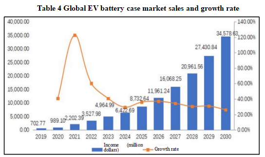 With the rapid growth of electric vehicle projects, the electric vehicle battery case industry is expected to grow rapidly. The global EV battery case market sales reached 4.965 billion US dollars in 2023 and is expected to reach 34.579 billion US dollars by 2030, at a compound annual growth rate (CAGR) of 32.39% (2024-2030).