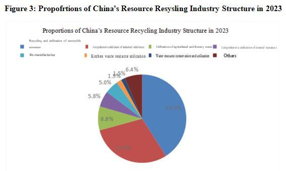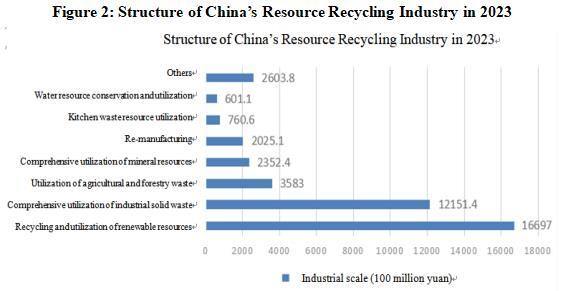 In 2023, the scale of China’s renewable resource recycling industry reached 1.6697 trillion yuan, accounting for 40.9%, making it the largest proportion in China’s resource recycling industry. The comprehensive utilization scale of industrial solid waste followed closely behind, with an industrial scale of 1.21514 trillion yuan, accounting for 29.8%.