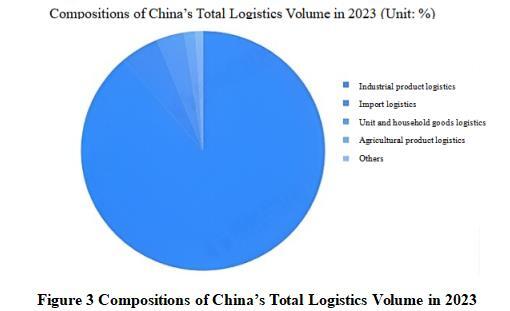 From the composition of the total logistics volume, in 2023, the total logistics volume of industrial products in China exceeded 310 trillion yuan, accounting for over 88%; the next was the total import logistics volume of 18 trillion yuan, accounting for 5.1%; the total amount of logistics in other fields was relatively small.