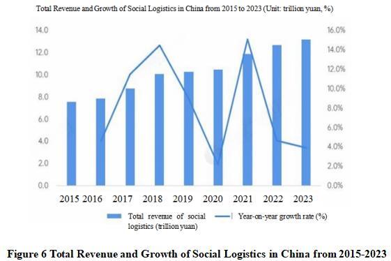 According to data from China Internet of Things, the total revenue of China’s logistics industry has been increasing year by year from 2015 to 2023. The total revenue of the logistics industry for the whole year of 2023 was 13.2 trillion yuan, a year-on-year increase of 3.9%, and the scale of the logistics revenue continues to expand. The year-on-year growth rate of basic logistics revenue such as transportation, warehousing, loading and unloading was around 3%, supporting the stable growth of the logistics market.
