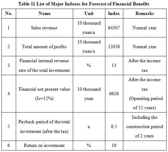 After the project reaches the production capacity, its annual sales revenue will be 643.07 million yuan, its profit will be 130.38 million yuan, its investment payback period will be 8.5 years (after the tax, including the construction period of 2 years) and its return on investment will be 19%.