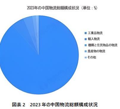 物流総額の構成状況を見ると、2023年、中国の工業品物流総額は310兆元を超え、88%を超え、次に、輸入物流総額は18兆元で、5.1%を占めている。他の分野の物流総額は相対的に小さい。