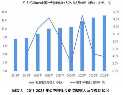 中物連のデータによると、2015-2023年、中国の物流業の総収入は全体的に年々増加傾向にある。2023年の年間物流業の総収入は13.2兆元で、前年同時期比3.9%増え、物流収入規模は拡大傾向を続けている。輸送、倉庫荷役などの基礎物流収入伸び率は前年同時期比3%前後で増加し、物流市場の安定した成長を支えている。