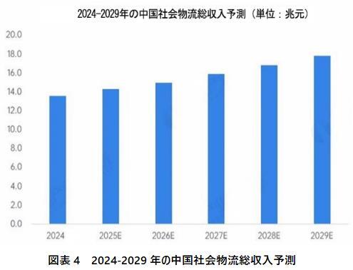将来、中国は現代流通システムの短所の補完に焦点を当て、現代流通システムの高品質な発展に着目し、現代流通の大市場統一の形成を加速し、現代商業貿易流通と現代物流の2大システムの発展などの面で中国の物流システムをさらに迅速に健全化する。近年の中国の社会物流総額及び社会物流総収入の変化傾向を展望し、今後数年間の中国の社会物流総収入に対して予測を行うと、2029年末までに、中国の社会物流総収入は17.9兆元に達する可能性がある。
