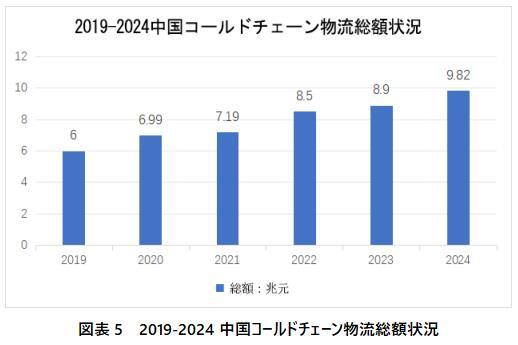 市場需要の持続的な増加、政府政策の支持、コールドチェーンインフラの継続的な整備、技術進歩と革新駆動に伴い、中国のコールドチェーン物流総額は絶えず増加している。中商産業研究院が発表した「2024-2029年中国コールドチェーン物流業界の研究と発展の見通し分析報告」によると、2023年の中国コールドチェーン物流総額は8.90兆元に達し、2022年より400億元増え、前年同時期比4.6%アップした。2024年の中国におけるコールドチェーン物流総額は9.82兆元に増加した。