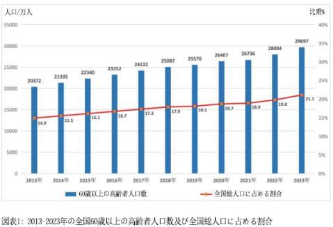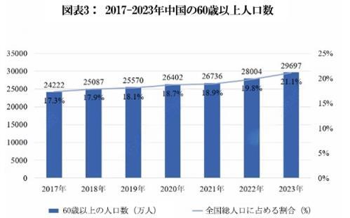 人口基数が膨大であることに加え、人口政策の変遷により、中国の未来が直面する高齢化の傾向はさらに厳しい。65歳以上の高齢者人口統計口径によると、2000年の高齢者人口の中国総人口に占める割合はすでに7%に達し、2021年に中国の高齢者人口の割合は14%を超え、深度高齢化社会に入り始めた。世界的に見ると、現在の中国の高齢化度は中上レベルに属し、2023年の中国の高齢者人口の占有率は15.4%であるが、フロストサリバンのデータによると、2023年の世界の高齢化の程度は14.2%であり、国際的に発達している北米及び欧州地域の同時期の高齢化の程度はそれぞれ24.1%と26.7%である。高齢者人口の数を見ると、2023年の中国の65歳以上人口は約2億人で、世界の高齢者人口の約4分の1を占めている。