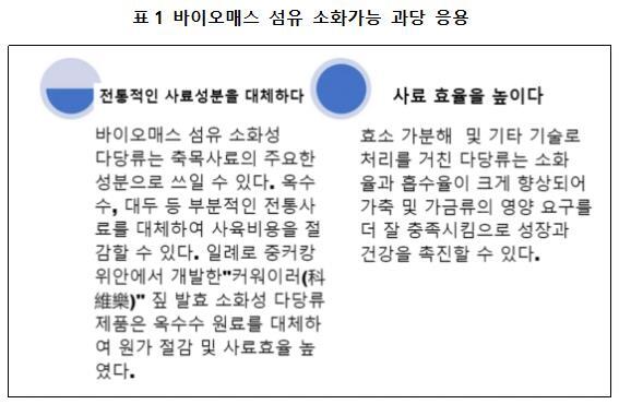 바이오매스 섬유 소화성 다당류는 바이오매스 섬유 중 다당 성분을 이용하여 효소분해 또는 기타 생명공학 수단 통해 소화 가능한 다당류 형태로 전환 하는 것을 말한다. 이 같은 다당류는 소화율을 높일 뿐만 아니라 가축 및 가금류 사육에서 일부 전통사료 성분을 대체하여 사육비용을 절감하고 사료 효율을 높일 수 있다.