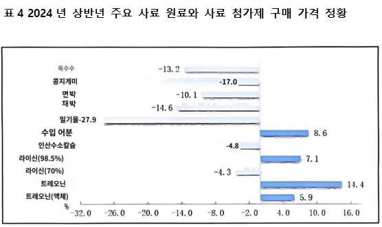 2024년 상반기, 옥수수, 콩지개미 등 주요 사료 원료 가격이 대폭 하락하였다. 사료기업에서 옥수수, 콩지개미 구매 평균가격은 각각 2,524위안/톤, 3,680위안/톤으로 전년 대비 각각 13.2%, 17.0% 하락하였다. 지게미류 가격 효과에 힘입어 면박(棉粕)과 채박(菜粕) 가격은 각각 톤당 3,746위안, 톤당 2,841위안으로 전년 대비 각각 10.1%, 14.6% 하락했다. 2023년 페루 어획 중단의 영향으로 수입 어분 가격이 계속 높은 수준을 유지하는 바람에 상반기 평균 구매 가격은 톤당 14,697위안으로 전년 대비 8.6% 상승했다. 아미노산 시장은 주요하게 넘치는 상태였고 비타민, 미네랄 원소는 약세로 운영되고 있다.