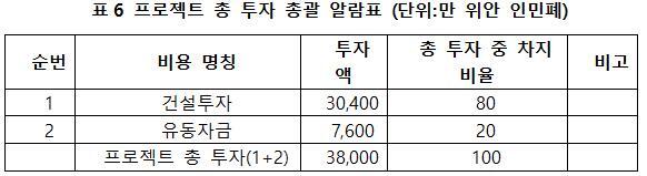 본 프로젝트 총 투자는 38,000만 위안, 그중 거설투자가 30,400만 위안, 유동자금 7,600만 위안이다.