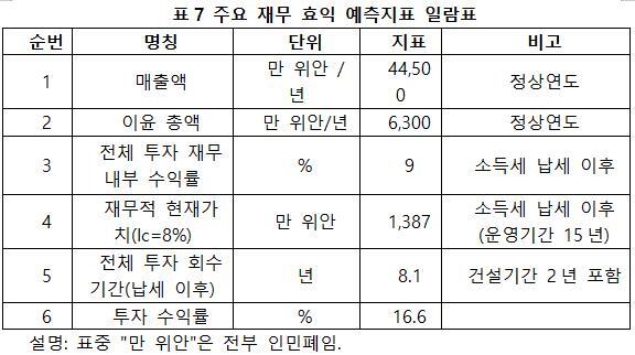 프로젝트가 설계 생산 능력의 생산량에 도달한 후, 연 평균 매출액은 44,500만 위안, 이윤 6,300만 위안, 투자히수기 8.1년(납세 이후, 건설기간 2년 포함), 투자수익률 16.6%이다.