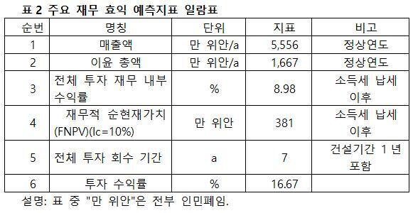 프로젝트가 설계 생산 능력의 생산량에 도달한 후 연 평균 매출액은 5,556만 위안, 이윤 1,667만 위안, 투자회수기 7년(납세 이후 건설기간1년 포함),투자 수익률 16.67%이다.
