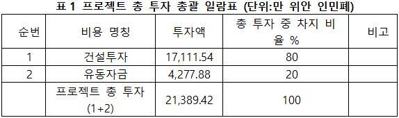 프로젝트 총 투자는 21,389.42만 위안, 그중 건설투자가 17,111.54만 위안 이다.
