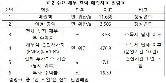 프로젝트가 실제 생산 능력의 생산량에 도달한 후 연 평균 매출액은 11,688만 위안, 이윤 3,506만 위안, 투자회수기 7.1년(납세이후 건설기간 1년 포함), 투자 수익률 16.39%이다.