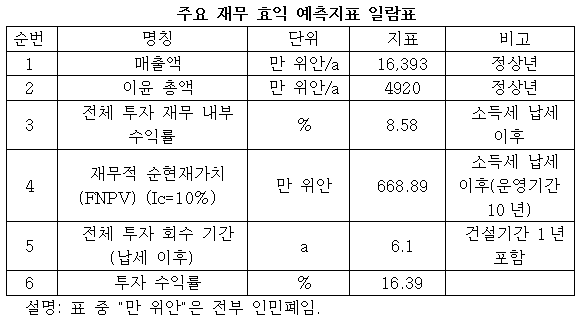 프로젝트가 설계 생산능력의 생산량에 도달한 후 연 평균 매출액은 16,396만 위안, 이윤 4,920만 위안 투자회수기 6.1년(납세 이후 건설기간 1년 포함), 투자 수익률 16.39%이다.